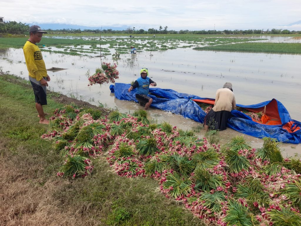 Brebes – Lahan tanaman bawang di dua kecamatan di Kabupaten Brebes terendam banjir. Petani terpaksa memanen sebelum waktunya agar cepat terjual meski harga murah.